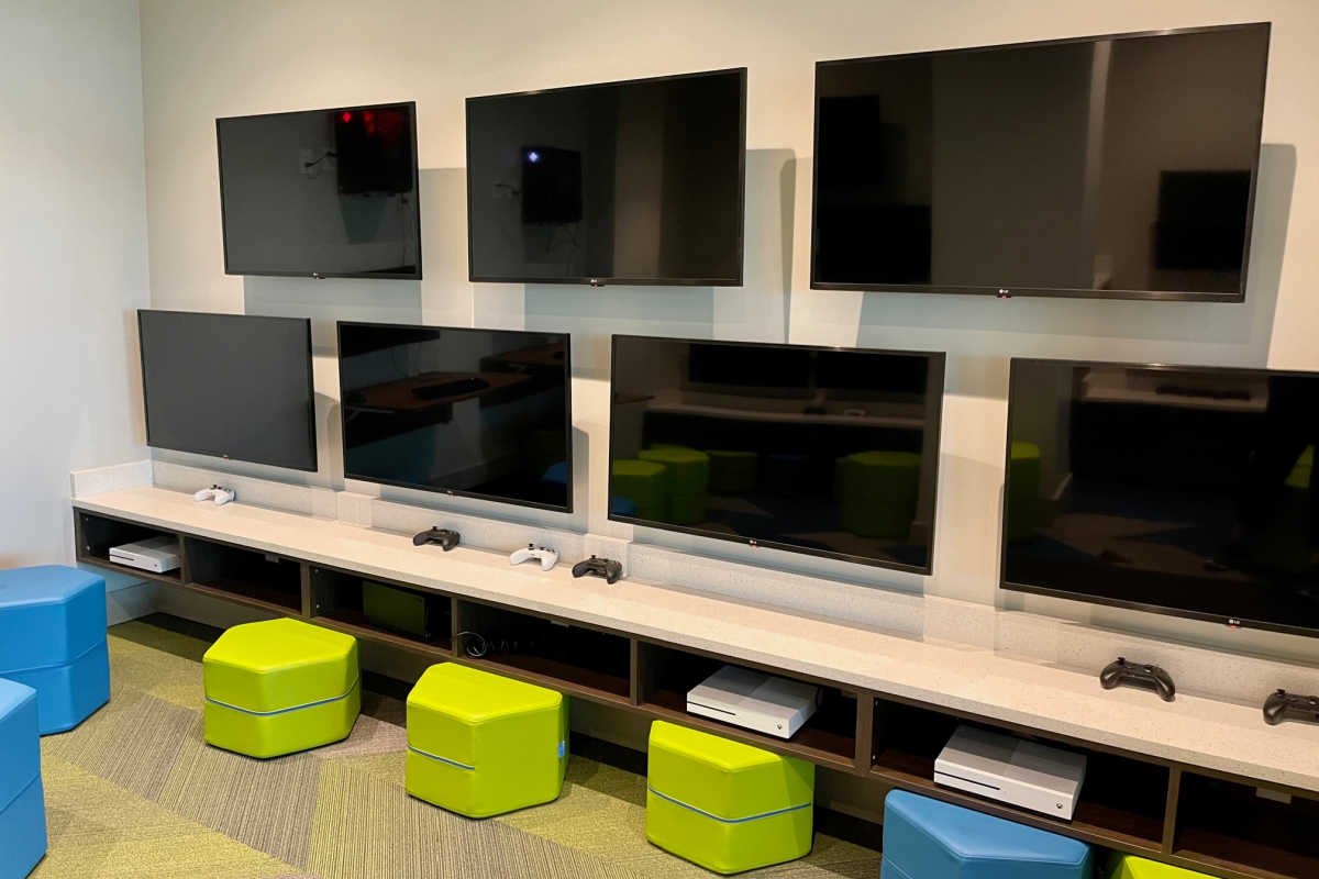 - SkyGate Club and Terrace – This place looks a lot different on game days (more on that below), but the rest of the week it is a great space to just hang out. There’s a pool table, shuffle board, big screen tvs, a gaming lounge with Xboxes and PlayStations, and complimentary soft drinks. My kids love to hang out here when we visit Tuscaloosa.