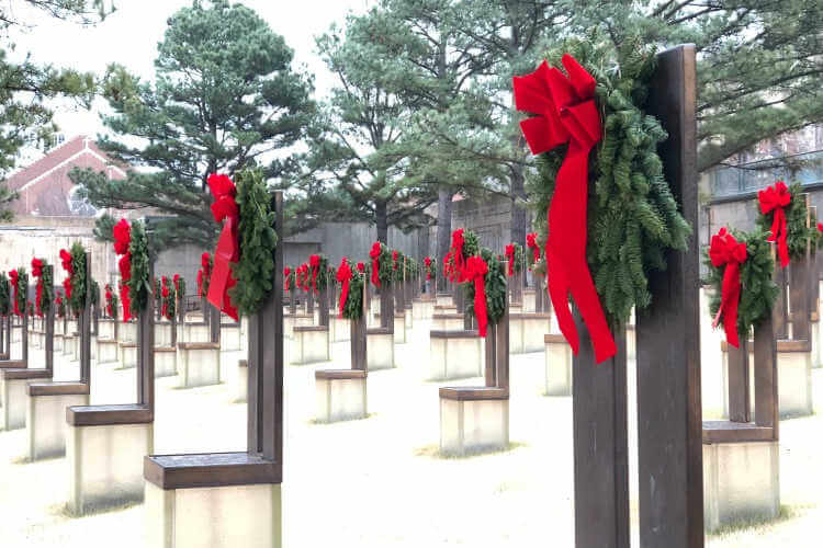 But perhaps the most beautiful spot to visit during the holidays in OKC is none other than the Oklahoma City National Memorial. A Christmas wreath is set upon each chair honoring those who were killed in 1995 during the bombing. – (Debra of Finding Debra)