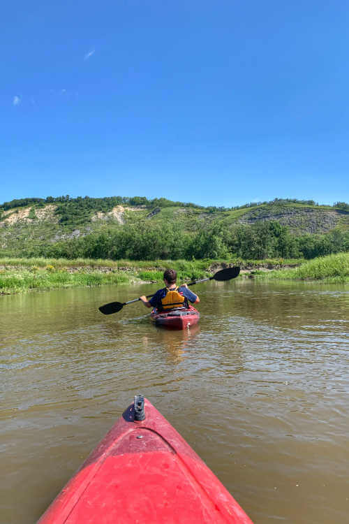 We picked up kayaks at Frost Fire, the local ski resort that operates several summer outdoor adventures in Pembina Gorge State Recreation Area. If you are looking for mountain biking trails in the area, start here at their terrain park, where they provide bikes and trail maps. They also arrange for kayak rental on the Pembina River, so once we were fitted with life vests, we headed for the water.